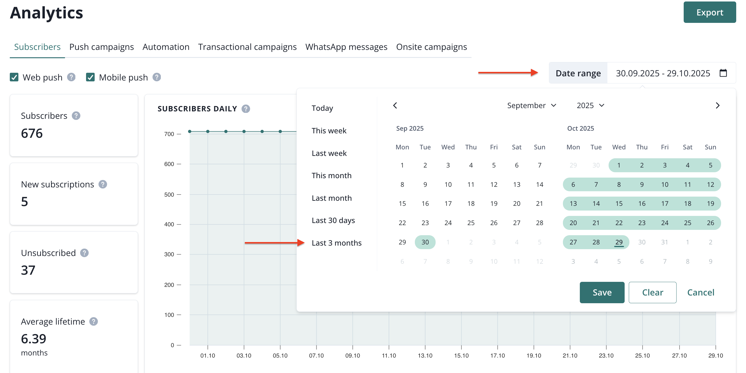 The same rule applies when exporting data from the page using the export option; you will receive a CSV file containing up to 90 days of results.