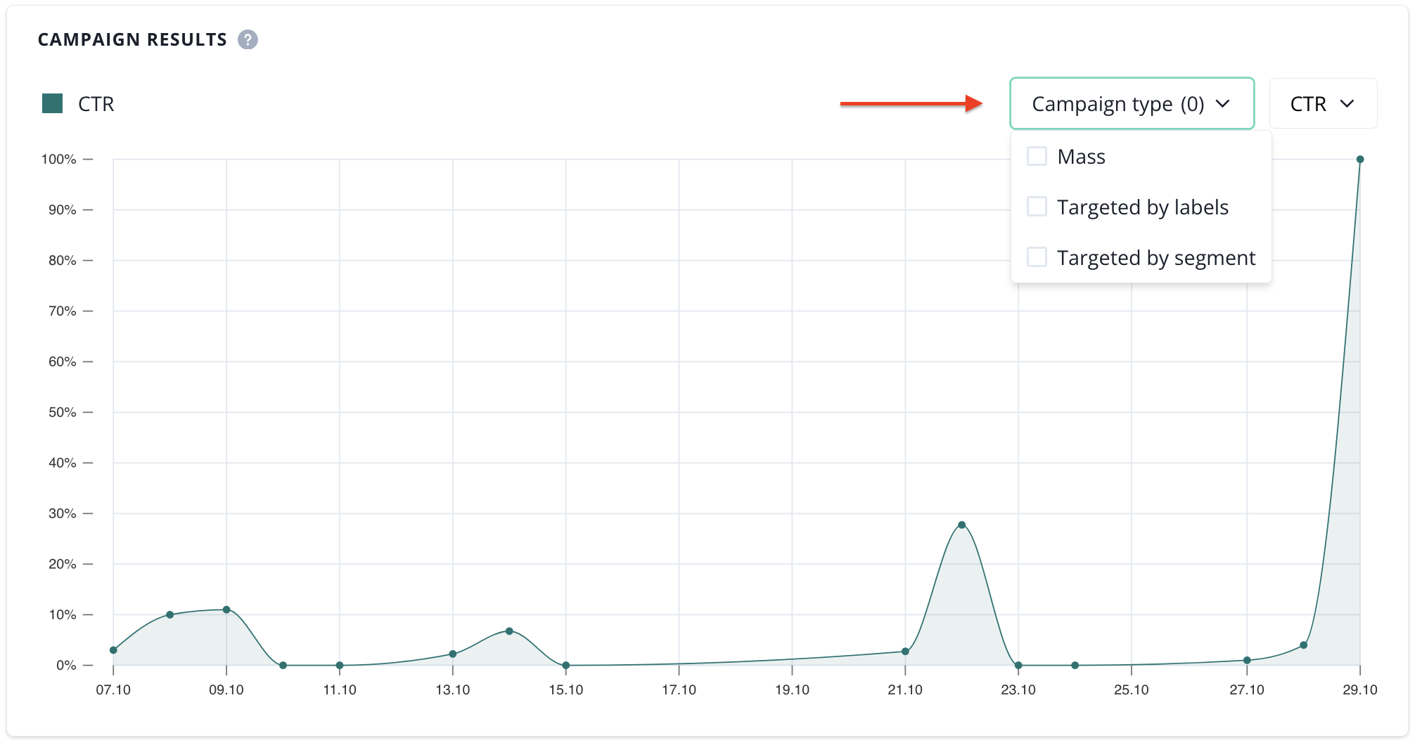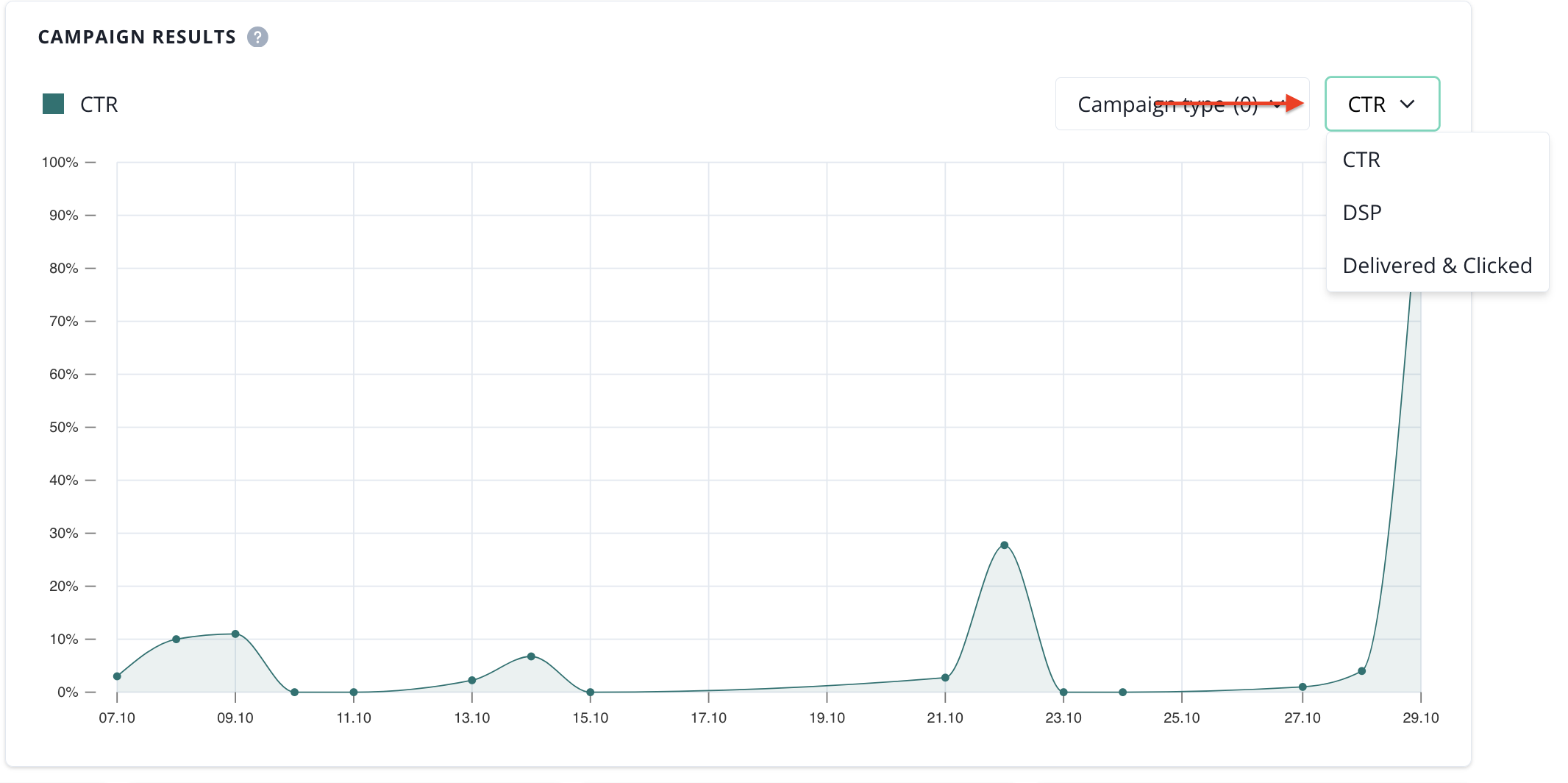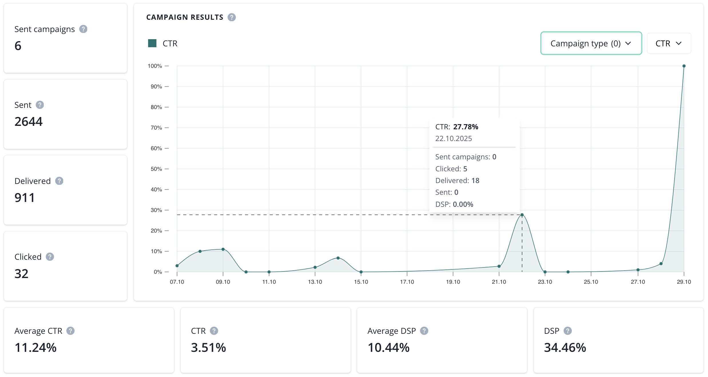 Right below these filters you will find a set of important metrics regarding your push campaigns. The campaign results chart can be filtered by the campaign type and metric (CTR, DSP, Delivered & Clicked):