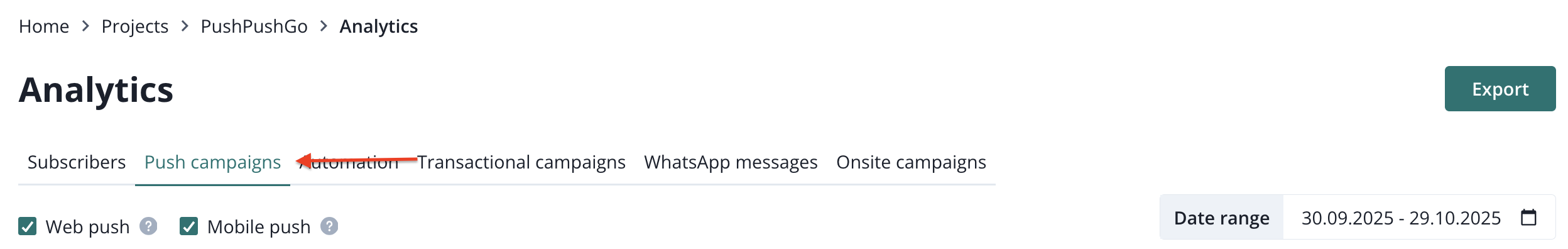 To find push campaign analytics page, you must switch to the correct tab while you are in analytics.