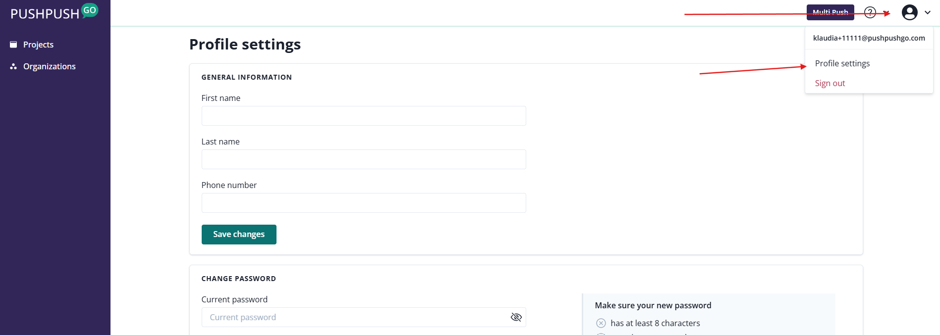 You can find the Profile settings in a drop-down menu in the top-right corner of the page.
