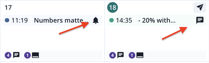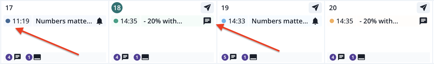 Campaigns can appear either inside the day container or below it, depending on the campaign strategy. Campaigns planned for a specific time range, and campaigns sent at a specific point in time (for example, a push notification) are shown inside the day container.