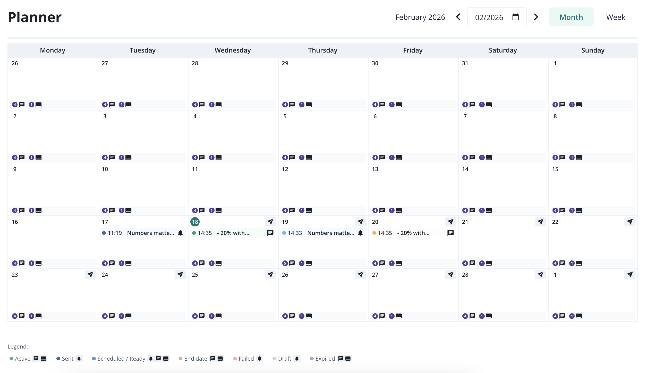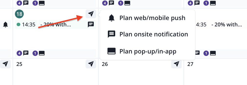 The Planner allows you to easily manage your campaigns. It provides information about which campaigns were sent on specific days and about scheduled campaigns. It shows web/mobile push, onsite and pop-up/in-app campaigns.