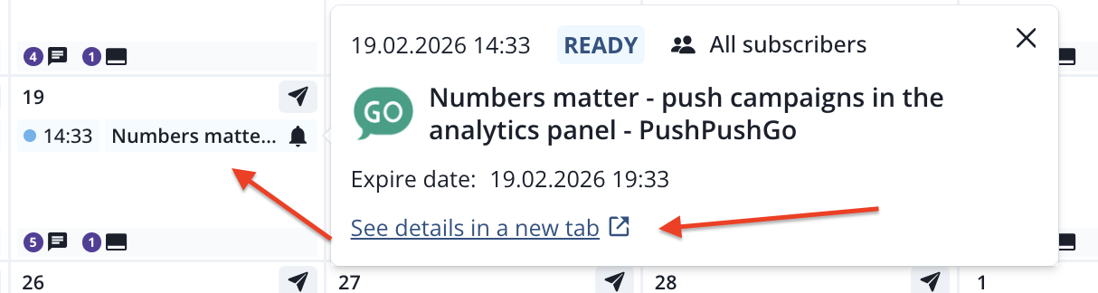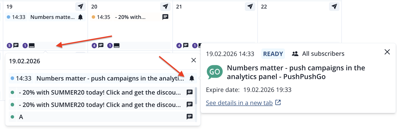 You can also expand a full list of campaigns for a selected day by clicking at the botton of the day container.