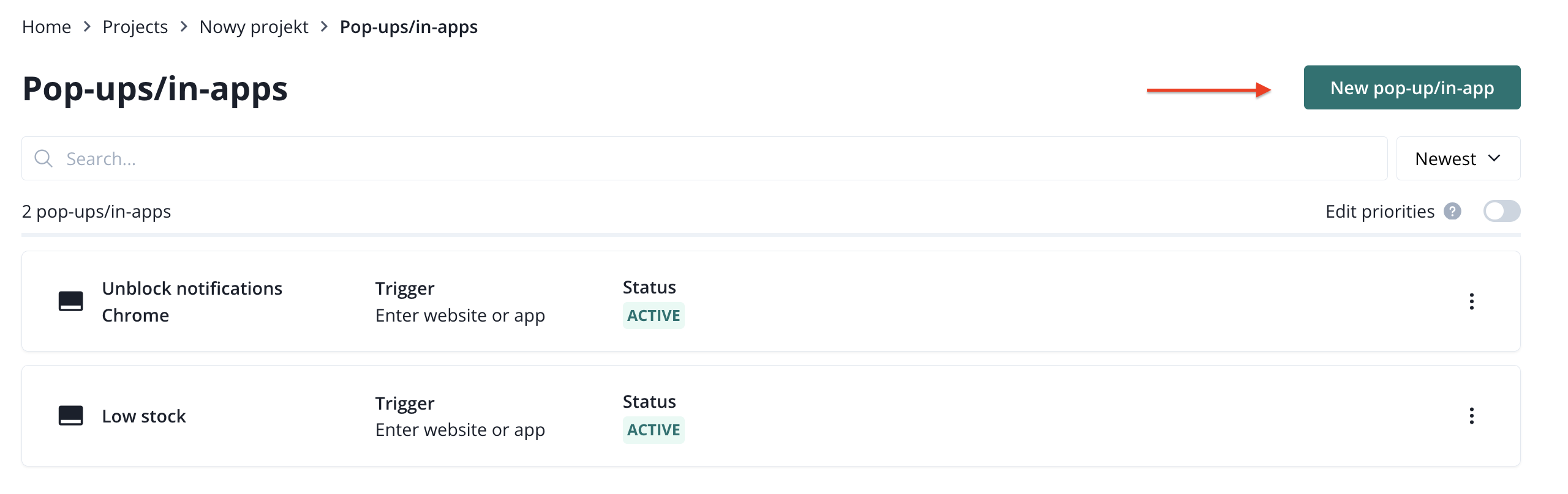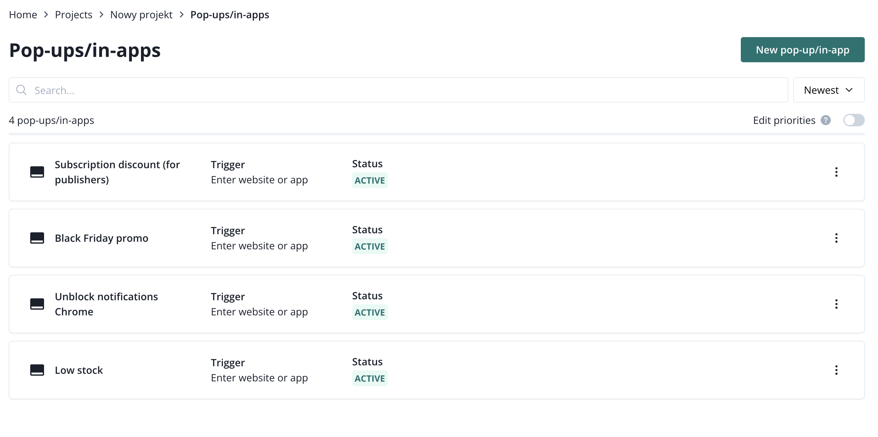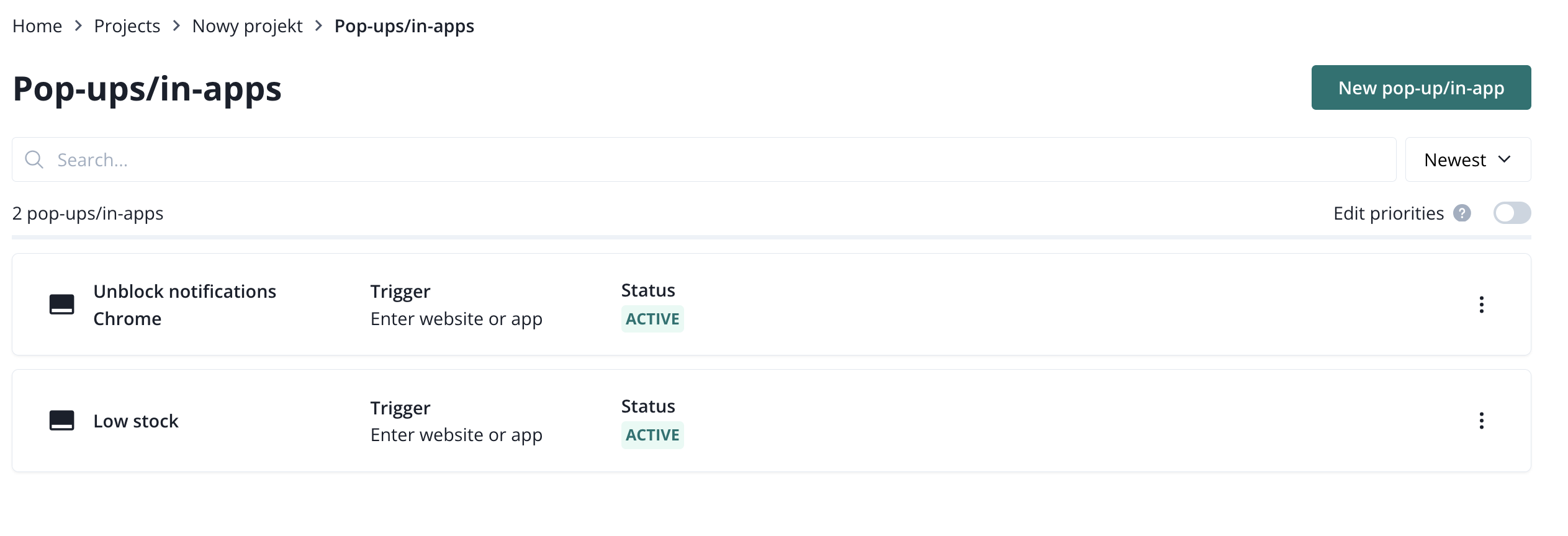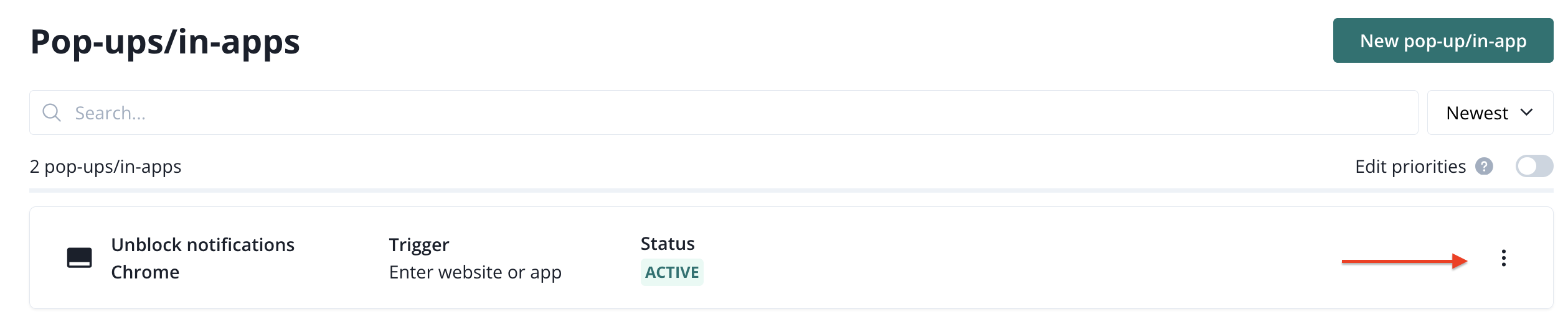 On the list, you can see each pop-up's/in-app's name, trigger, and status. You can edit pop-ups/in-apps and access additional options by clicking on the three dots.