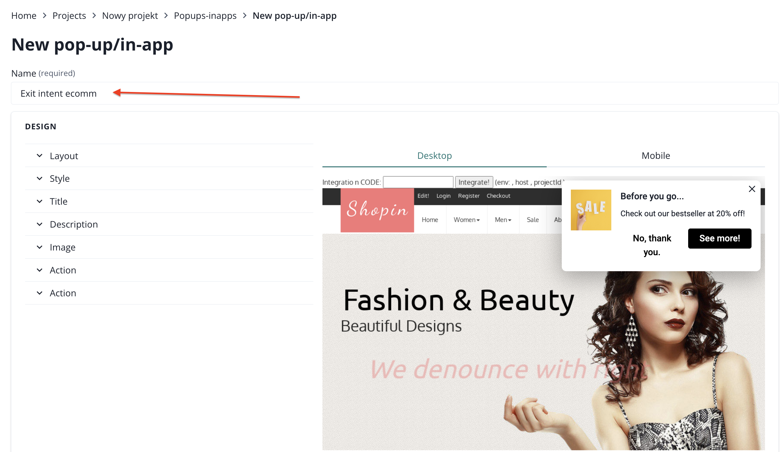 After selecting the pop-up/in-app template for your use case, click on it to tweak its style and content. Start from naming your pop-up/in-app.