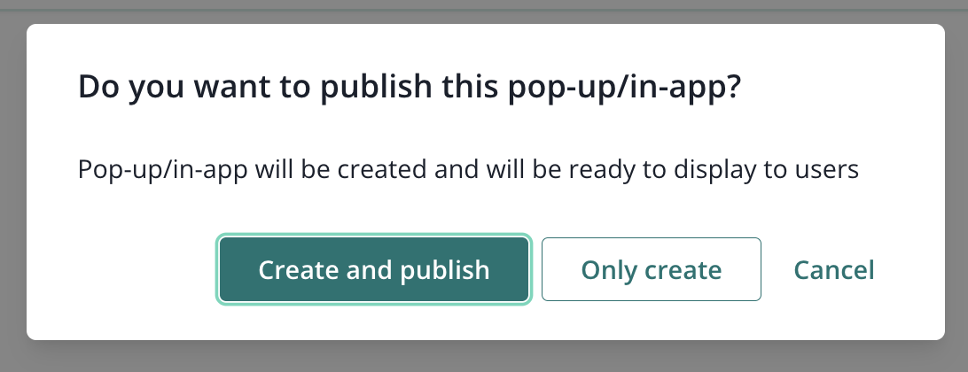 The system will ask you to confirm whether the pop-up/in-app should be published immediately or only created.