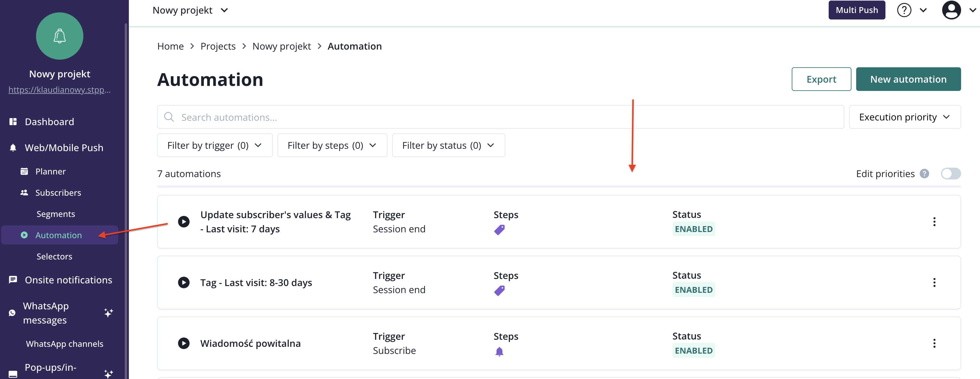 Automation list can be found under Automation tab in the PushPushGo's main menu. After accessing that section you will see the list of currently configured automations on your project. You can use the search function, filters, and sorting to adjust the list view.