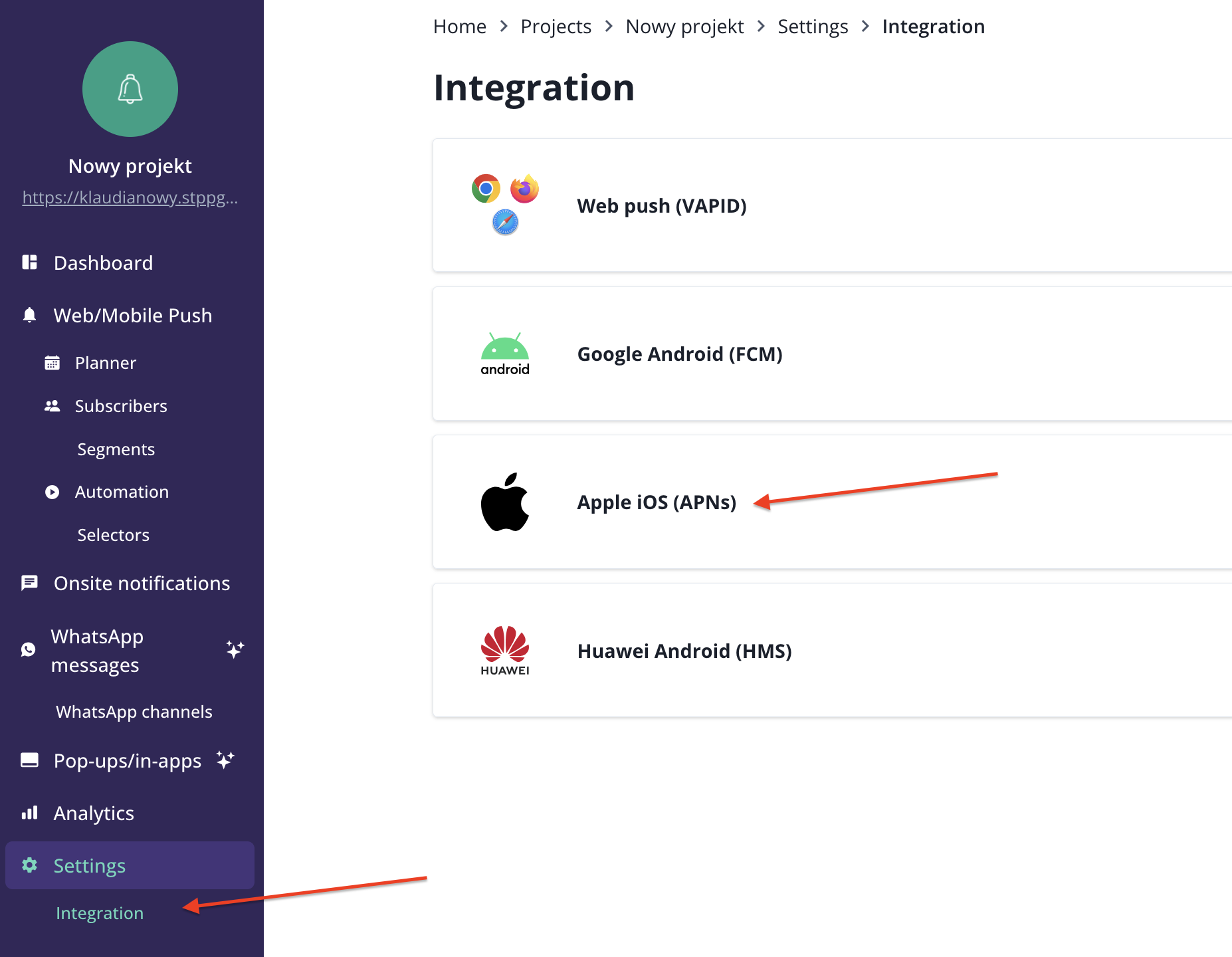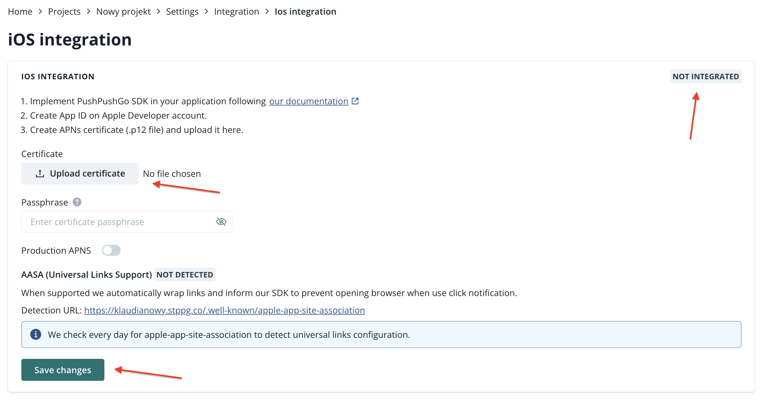 To complete integration, register App ID on Apple Developer account, create APNs certificate (.p12 file) and upload it in the Integration section. Start from getting your certificate.