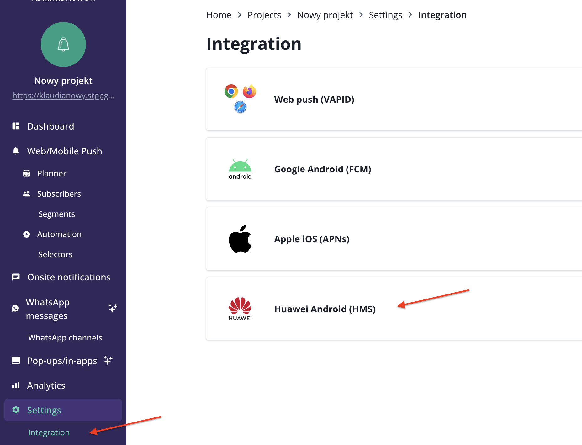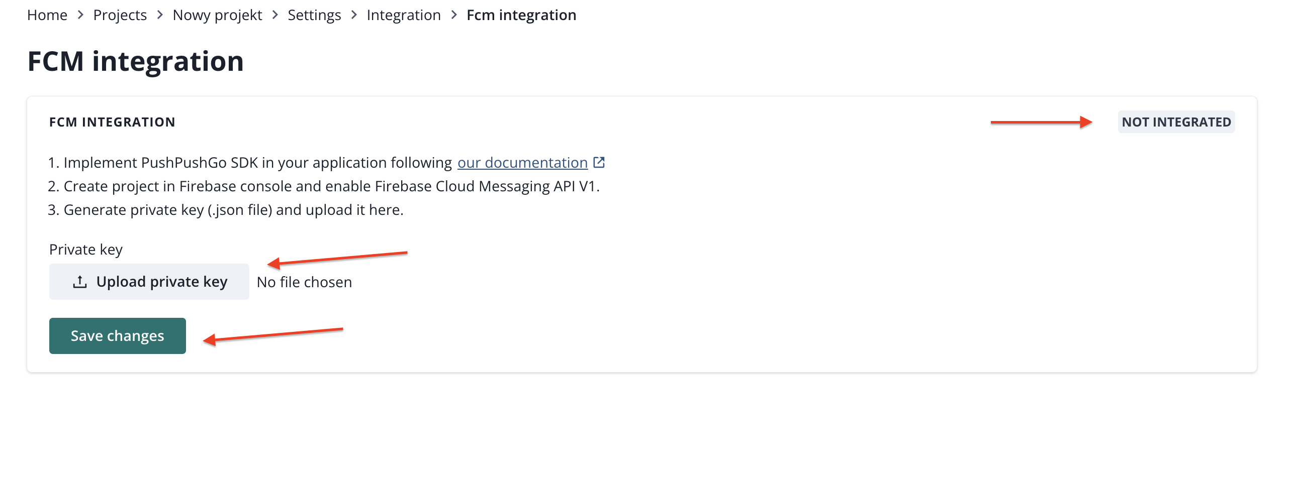 Generate a private key in Firebase console and upload it in our application. Go to Integration page in PushPushGo application: