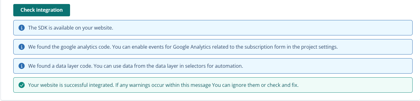 1. Check integration validators in Integration section: Integration > Web push (VAPID) > Integration scripts