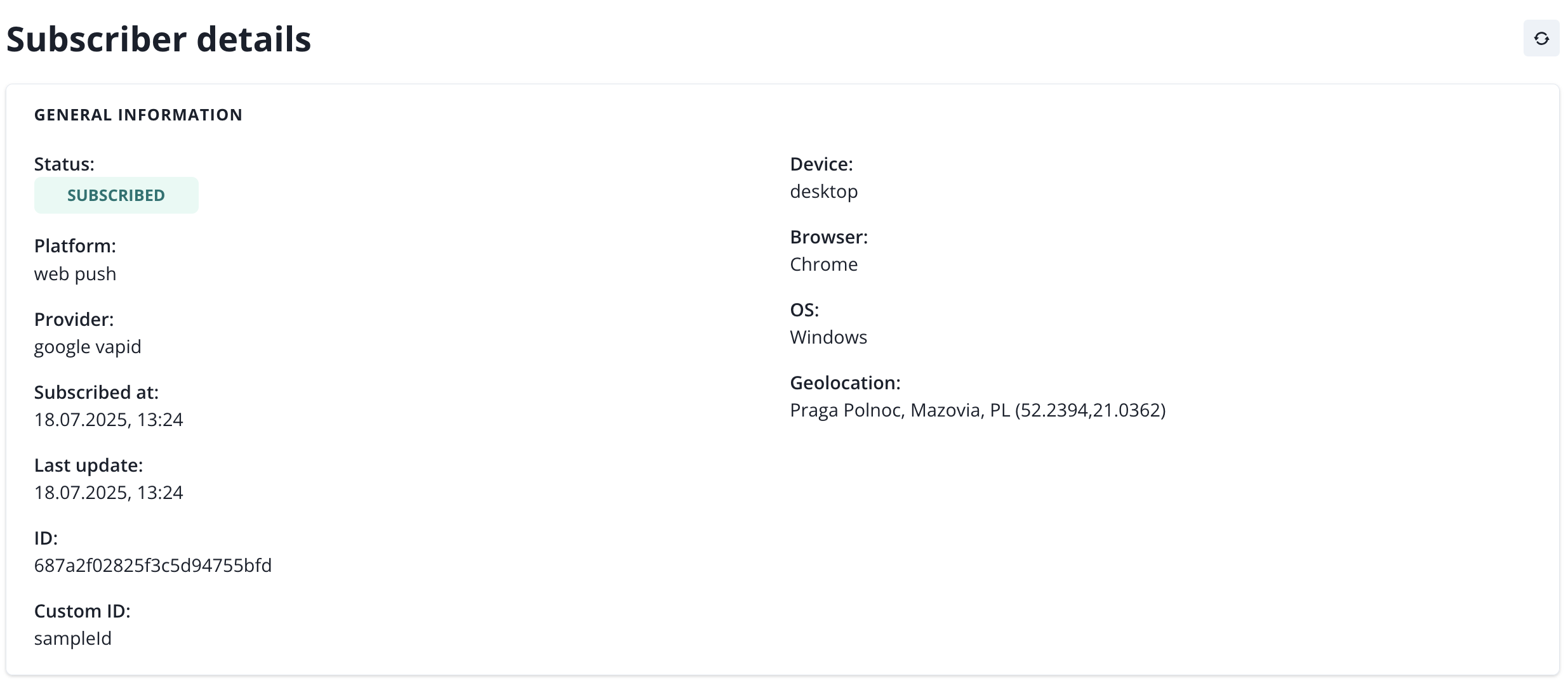 Subscriber ID can be found on the Subscribers' list, on the subscriber card. If custom ID has been passed to us, it will be visible as well, right under Susbcriber ID. If it was never setup, it will show: sampleId.