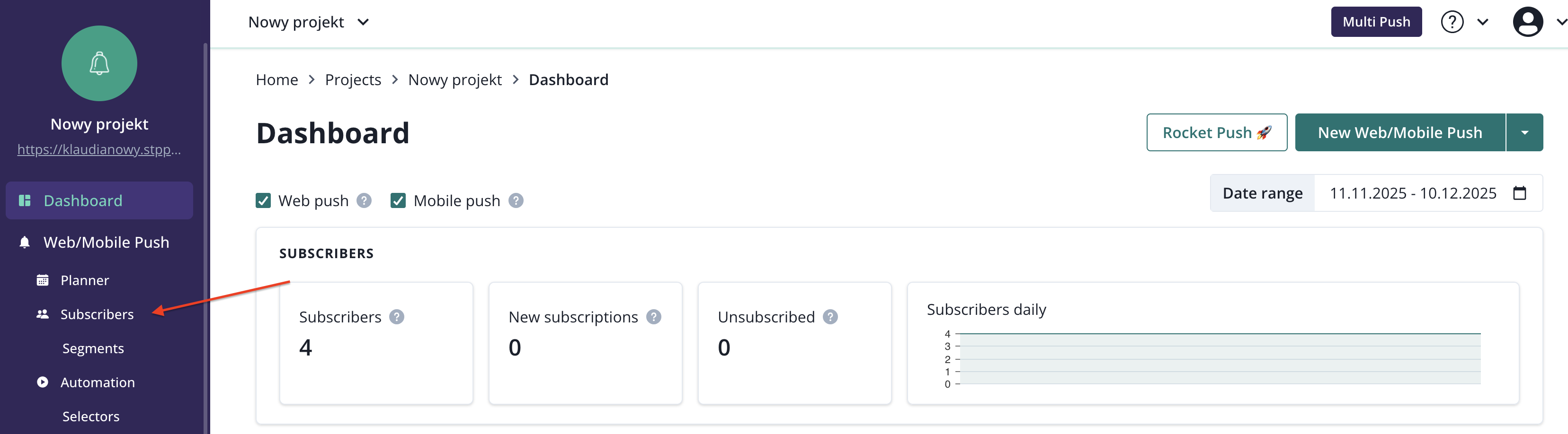 Subscribers page refers to your web push and mobile push subscribers. It can be accessed from the main navigation bar.
