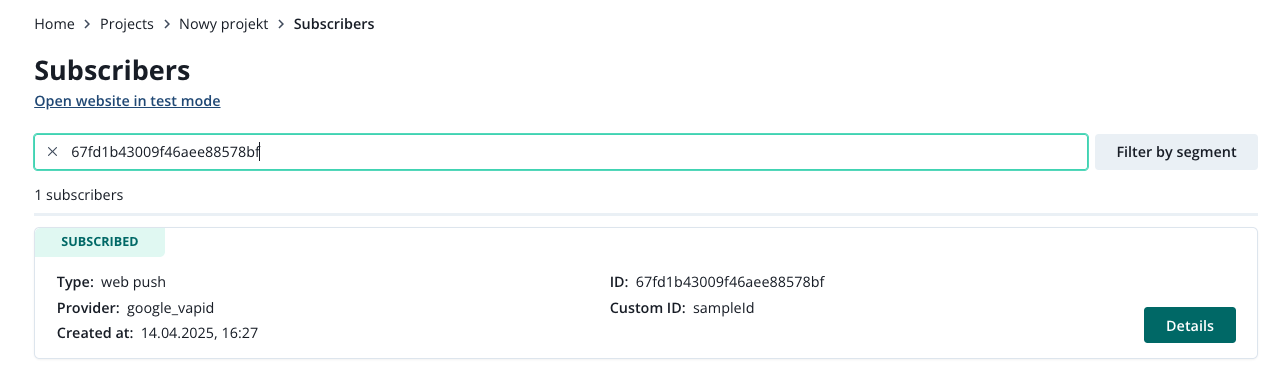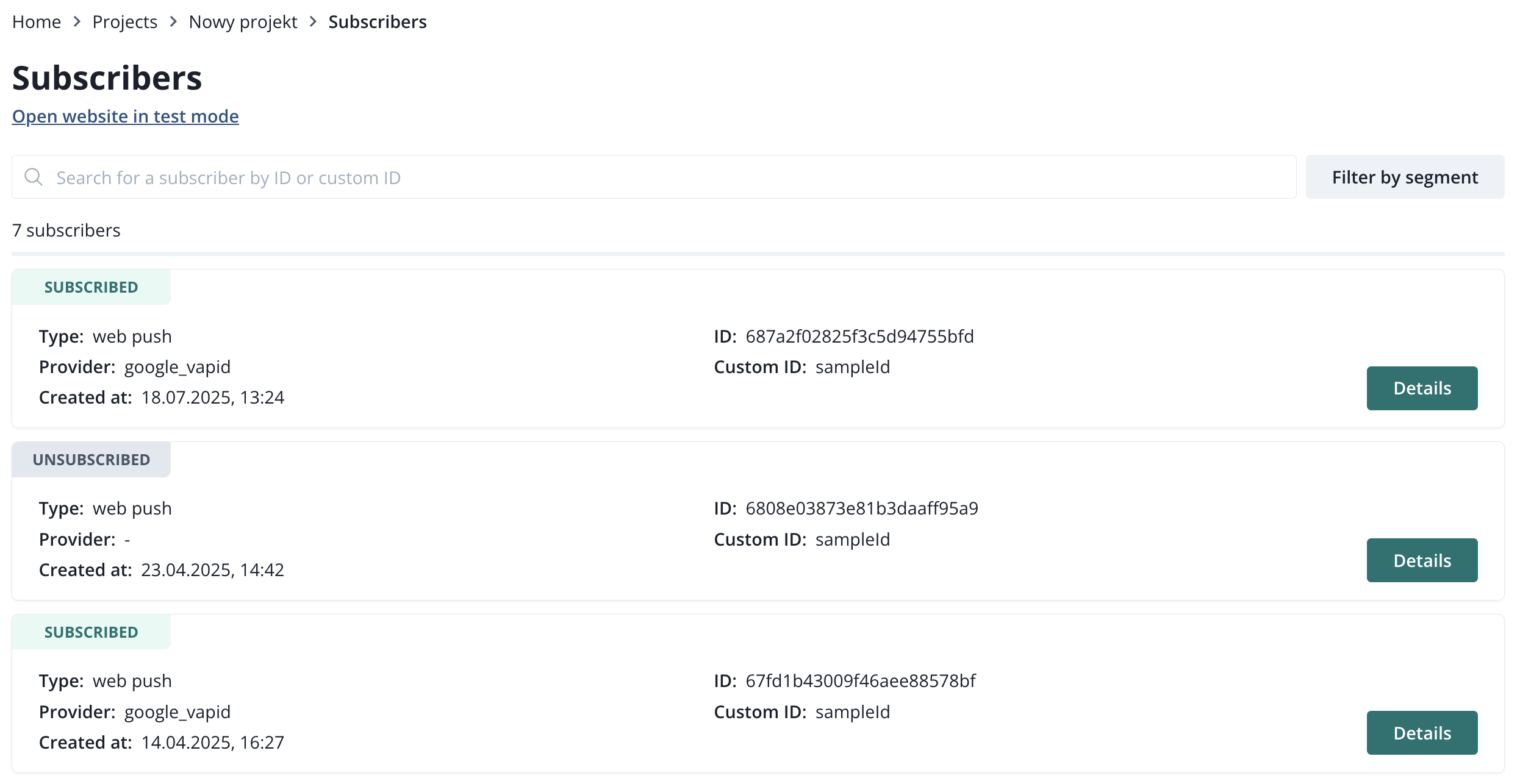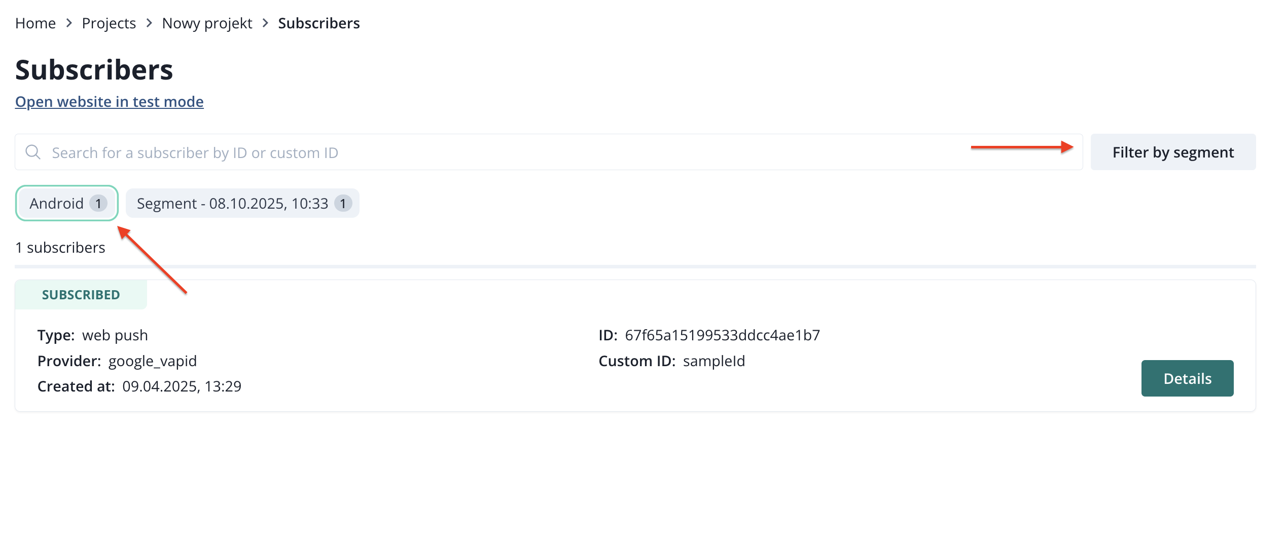 You can search for a particular subscriber using its ID or Custom ID (if you use custom IDs). You can also filter by segments.