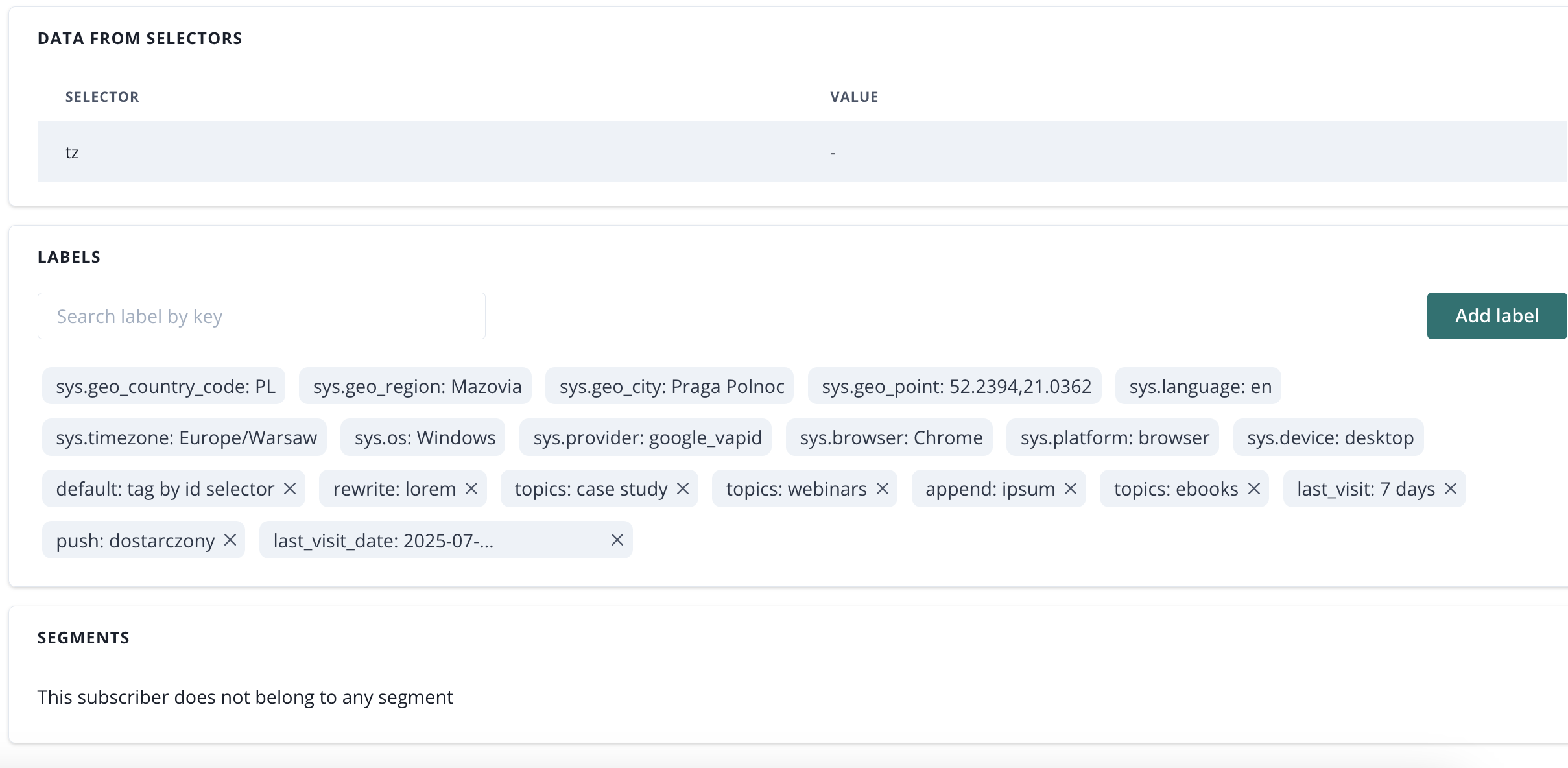 Manual proces of adding a label to a particular susbcriber comes in handy when you are tesing your segmentation rules based on selectors or automations. If you label your subscriber, you can later restrict rules and automations only for your subscriber, before they are ready go go live for the whole subscribers base.