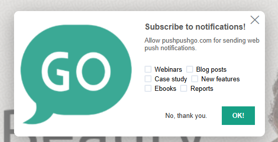 Comes from the browser itself, it is simple, most common and only requires one click to complete the subscription. You cannot change its appearance, content etc., but you can choose the moment when it should appear and in which sections of your website (see subscription form behavior below).