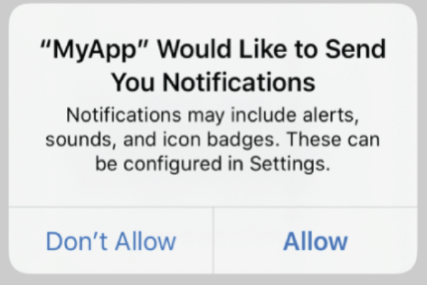 On iOS, push notifications can only be authorized through the native Apple permission dialog. This prompt appears when the app calls requestAuthorization.
