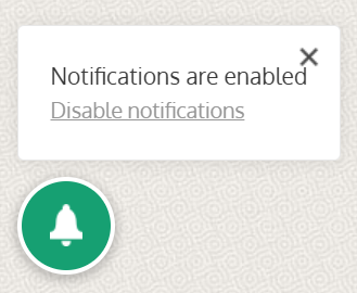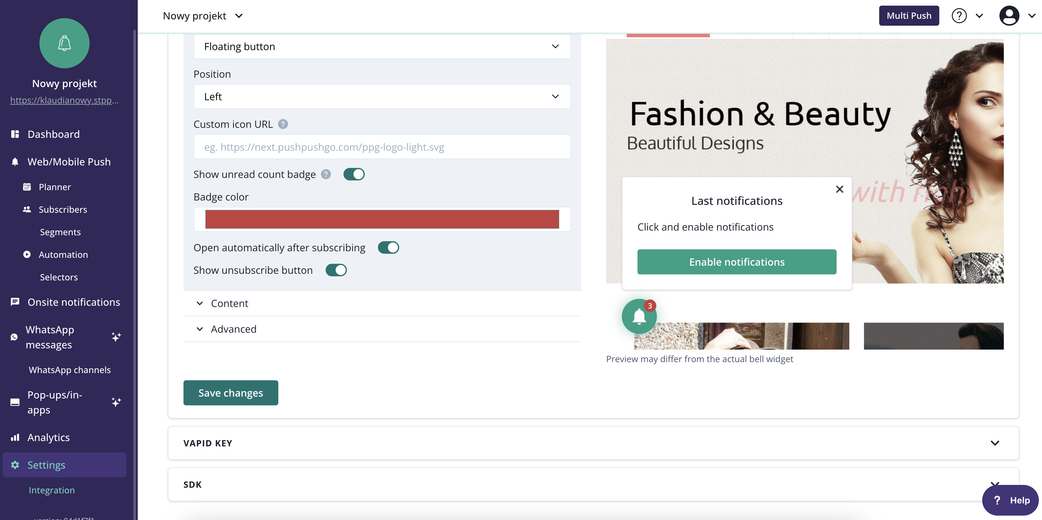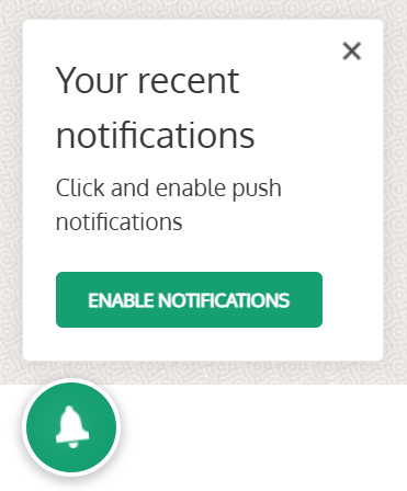 To enable and configure the Bell widget go to the "Integration" tab > Web Push > Bell widget. Here you can add custom texts displayed to the user, the color of the bell icon, and the button text.